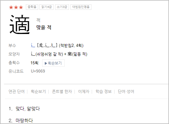 자신이 찾고 있는 한자가 있으면하는, 선택하여 찾아볼게요. 그러면 그 한자에 대하여서 세밀한 정보가 사료됩니다. 난이도, 대법원 인명용 여부, 부수, 모양자, 총 획수, 유니코드, 뜻 등 가지가지 정보 등을 볼 수 있다고 합니다.